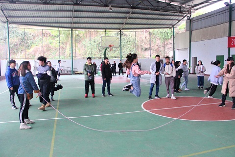 党总支副书记冉明出席活动并发表讲话,并希望同学们在保证安全情况下团结协作,赛出风格、赛出水平。随后裁判讲解比赛为积分制,个人所得名次积分统计在班级总积分中,并组织各班派代表抽签分组,比赛正式开始。跳绳比赛形式为班级赛,计时两分钟。共16个班级分为三组进行。只见同学们身手敏捷,一根根飞舞的绳子,一队队腾空跳跃的身影让人眼花缭乱。随着一声哨响,滚铁环比赛也已经开始,有的同学从容不迫,控制着铁环;有的同学虽有些踉跄,但也不甘示弱,大家各显身手,欢声雷动。镜头转到踢毽子比赛,五彩的毽球在空中飘逸的飞舞,尽管大家的水平参差不齐,但每一位参赛的同学都使出浑身解数,赢得了观众一次又一次的欢呼。