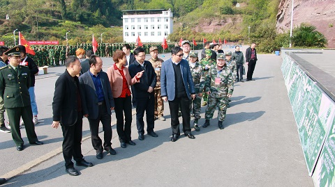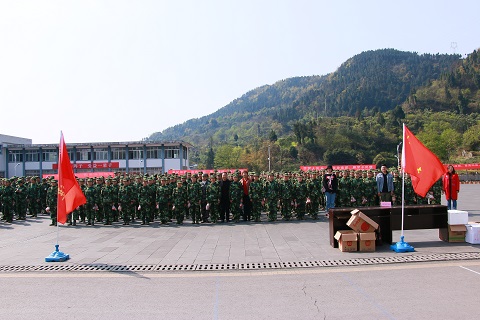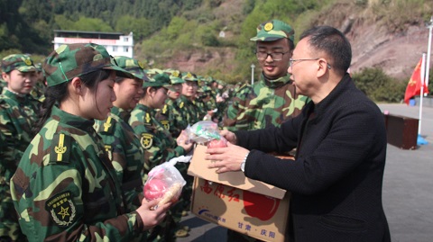 3月26日上午公司党总支书记阮碧辉与副书记冉明带领学工办主任罗方芫、兼职辅导员崔维广、王子言到达州市国防教育基地慰问公司2018级军训学员。