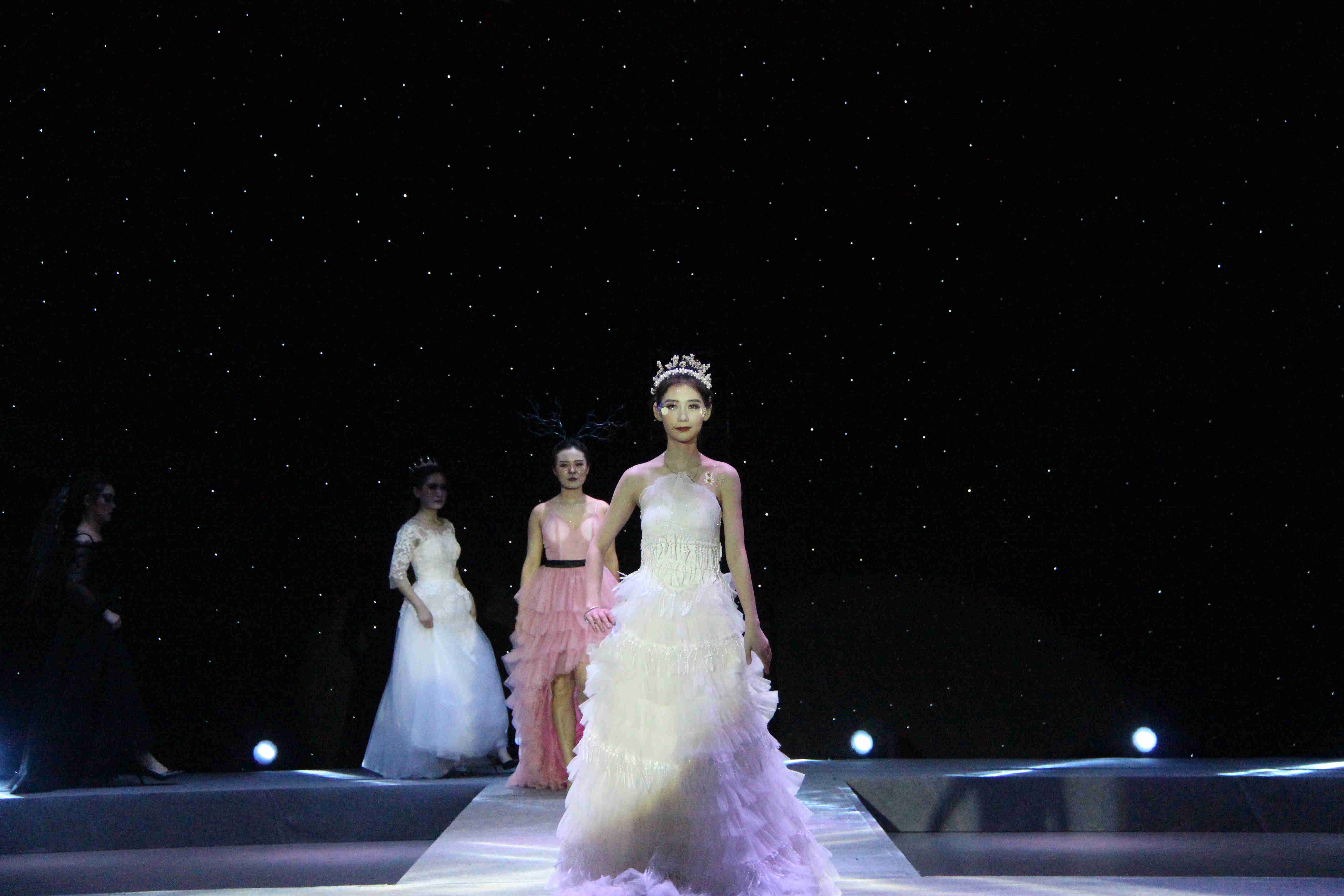 晚会在主修生们进行化妆以及造型设计的学习生活视频中拉开帷幕,首先向大家展示的是由齐茂竹、谭磊设计的《渡》,该主题以清新自然,淡雅清透的特点让在座的各位眼前一亮;